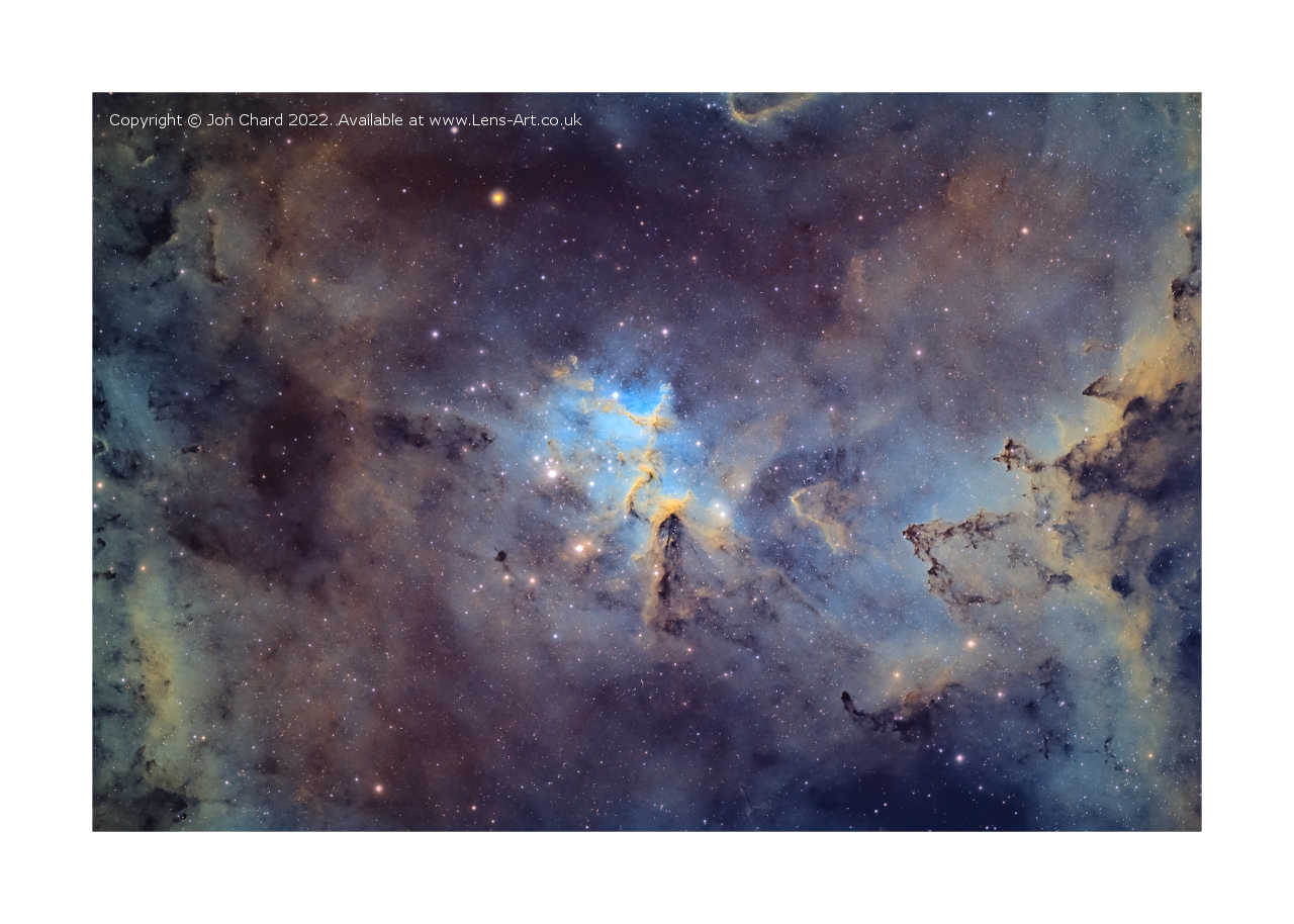 Cosmic clouds form fantastic shapes in the central regions of emission nebula IC 1805. The clouds are sculpted by stellar winds and radiation from massive hot stars in the nebula's newborn star cluster, Melotte 15. About 1.5 million years young, the cluster stars are scattered in this colorful skyscape, along with dark dust clouds in silhouette against glowing atomic gas.